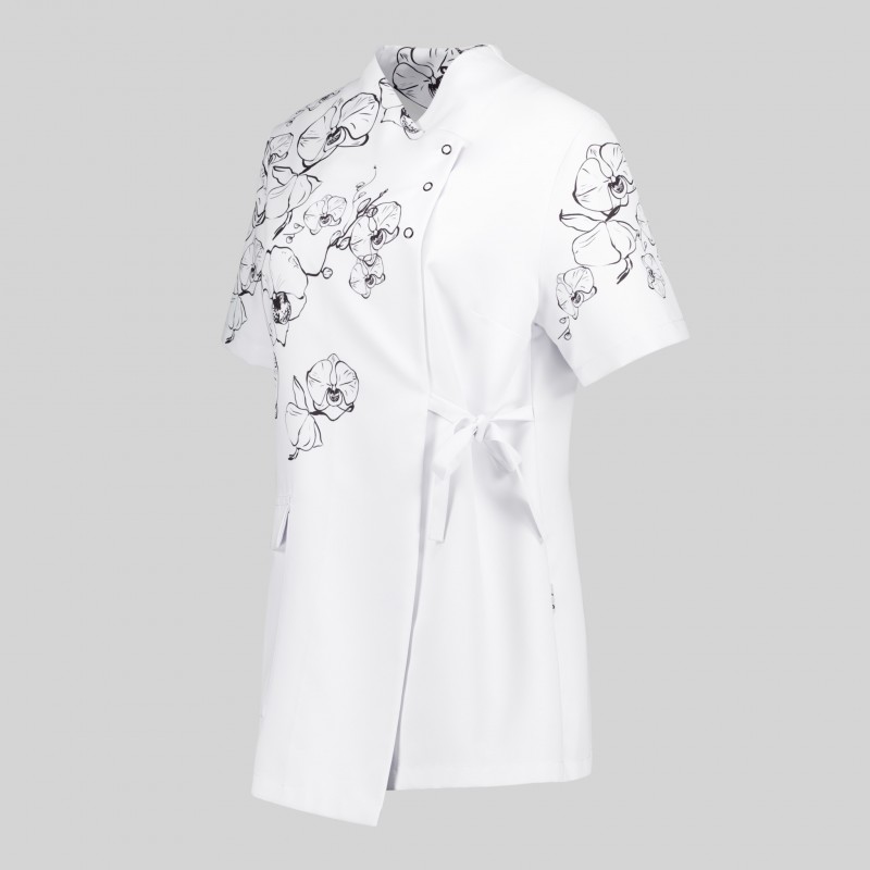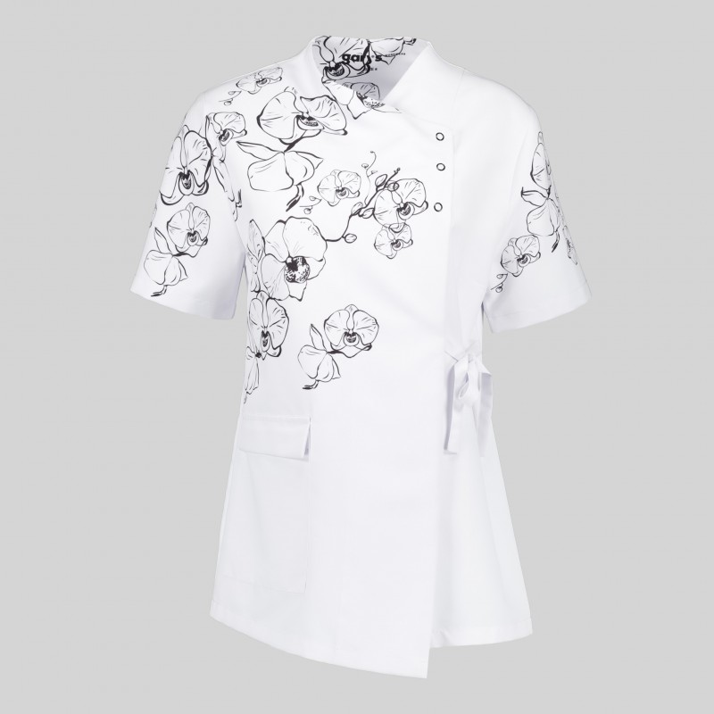 Questa camicetta da donna a maniche corte presenta un design incrociato che aggiunge un tocco di eleganza e originalità alla vostra uniforme, facendovi notare nel settore della bellezza.