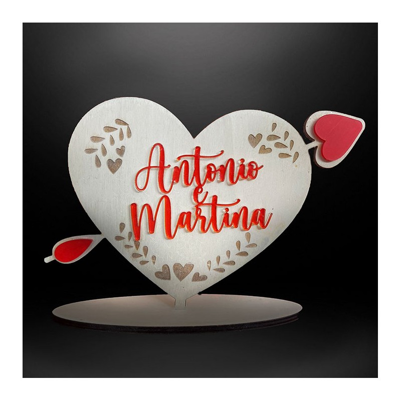 Cuore in Legno con base, con applicazioni di nomi in Plexiglass Rosa o Glitterato.