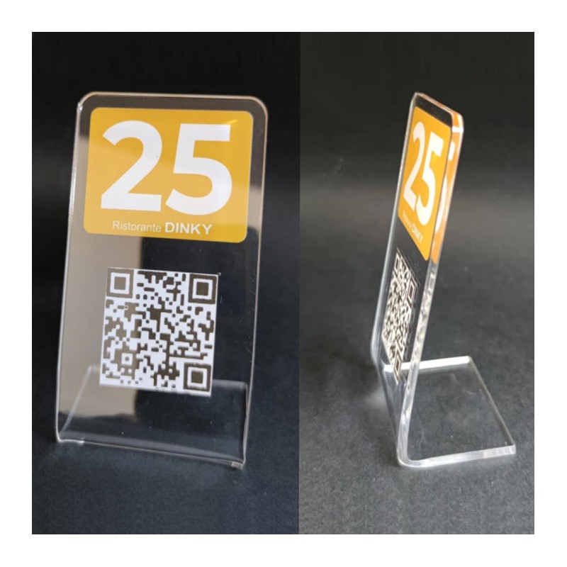 Segnatavolo in Plexglass Trasparente con personalizzazione UV Numero e codice QR, realizzato con tecnica al laser, modellato interamente a mano con grande passione.
