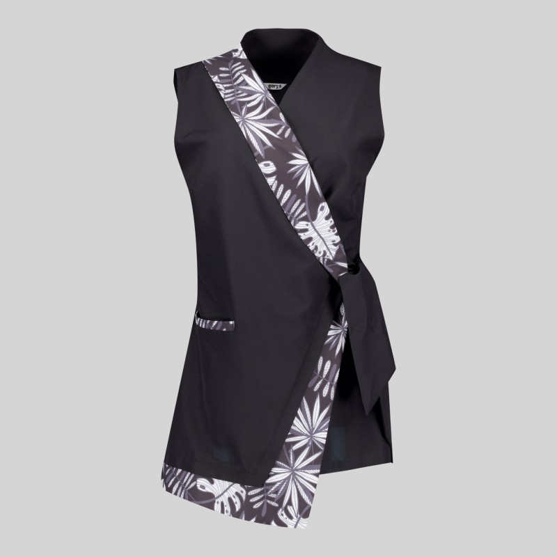 Senza maniche e con un raffinato colletto a giacca, questa blusa presenta un taschino a filetto sul davanti destro e dettagli stampati che aggiungono unicità e stile all'uniforme. Le pinces posizionate strategicamente sulla schiena, sul petto e sul davanti offrono una vestibilità sartoriale, impreziosita da un nastro da annodare in vita.
