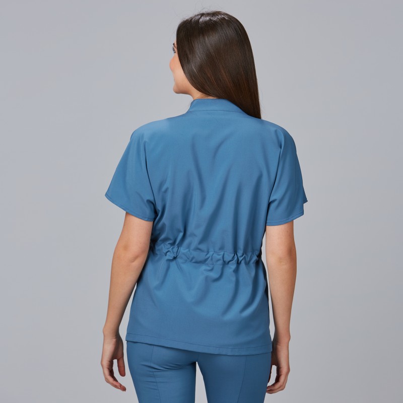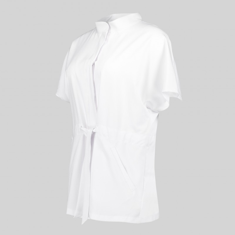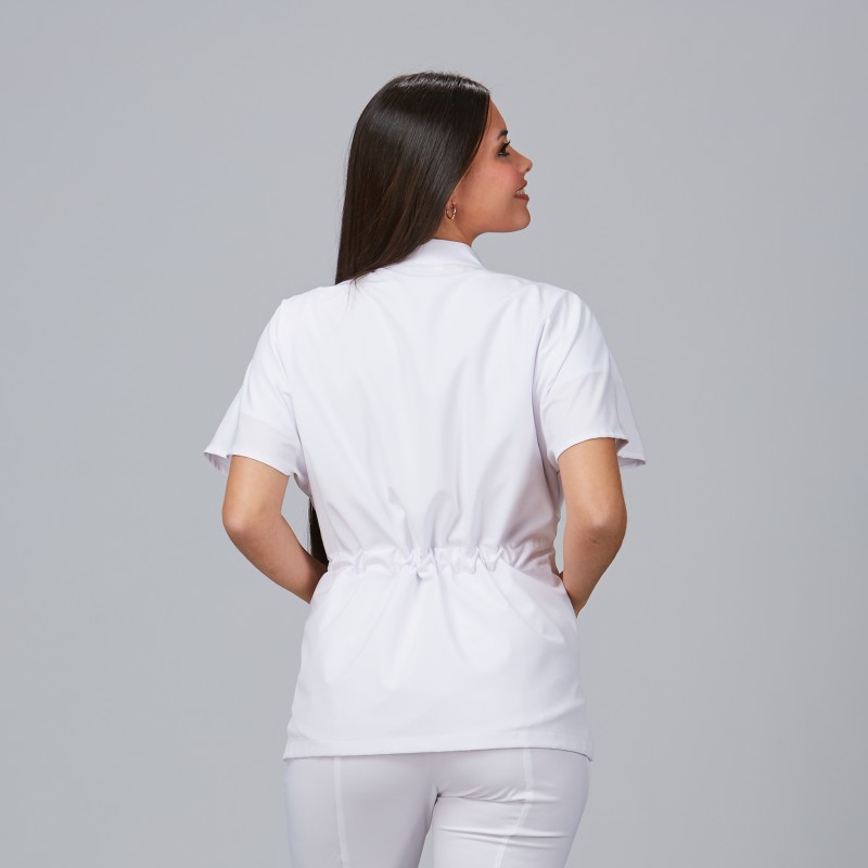 La blusa MAGNOLIA WOMAN, un capo progettato per distinguersi nell'ambiente della bellezza professionale, con lo scollo rotondo e la zip sul davanti le conferiscono un tocco moderno e pratico